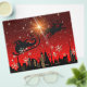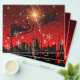 Santa Claus with his Reindeer flying in a sleigh over the city.  Red night sky and snowflakes.  frontiernow.com