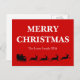 This postcard with a black silhouette of Santa Claus riding four reindeer on the sleigh filled with a big bag of gift on bright red background and white cheerful merry Christmas text and the family name sends a warm sweet cheerful loving holiday season greeting message. Customise it to make it special.