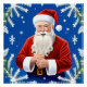 Cheerful Santa Claus in traditional red attire surrounded by a winter-themed background featuring snowflakes and pine branches. Perfect for holidays and Christmas-themed designs.