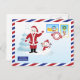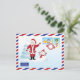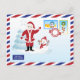 Christmas postcard with no text – you can write with a pen in it or you can pick a font and personalise it right now - that features a square envelope with borders in dark blue and red. It has an illustration of Santa Claus in the snow waving near a white tree and a snowman. There’s a small blue label that reads “AIR MAIL PAR AVION “ because all mail from the North Pole is a priority. It must arrive in time for Christmas! This Express Mail envelope has two colourful stamps: in one, there are a snowglobe and Christmas presents, on the other, there’s a Christmas wreath with a yellow bow and red bells. Santa likes to use snail mail. He’s kind of an old-fashioned guy!
