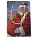Trump dressed as Santa Claus holds a large sack filled with wrapped gifts standing in front of a snowy White House.