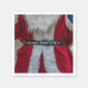 A close up photograph of a Santa costume with the message "Merry Christmas" written on the belt printed on paper napkins.