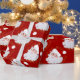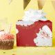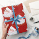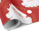 Santa Face Circles-Santa's sporting is red Santa hat and gold glitter glasses. Red and gold text circles around and reads: Ho Ho Ho, Merry Christmas! The background is solid red. This Santa wrapping is available with assorted background colours. It's also available as an allover Santa without the circled text.
