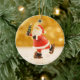 A round Christmas tree ornament featuring a photograph of a Santa Claus figurine ice skating while holding a Christmas tree. The same image is on both sides of the ornament.