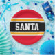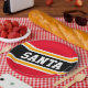 This sporty, Christmas holiday design features athletic SANTA text inside a highlighted wide black stripe with white and yellow pinstripes against bright red outer stripes. The text in this design can be personalised.