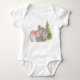 This cute bodysuit features a Santa Gnome standing outside his stone house. A decorated Christmas tree stands in the yard and the sky is twinkling with snowflakes.