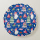 Santa Gnome for Holidays Pattern Blue Background Round Pillow. Features a blue background pattern with gnomes, presents, holly, candy canes, Christmas trees, and Santa's bag. Personalise this to tile your own image.