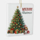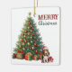 On the front of this Holiday ornament is the image of an adorable Basset Hound puppy wearing a Santa hat and sitting beside a decorated Christmas tree with gift packages. The red and green text at the side says "MERRY CHRISTMAS". The back of the ornament has the same image, but the text says "HAPPY NEW YEAR". The text may be customised so something else, if you'd like.