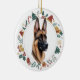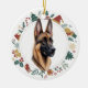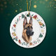 This pretty Holiday ornament features a watercolor image of a beautiful Belgian Malinois Dog. The image is framed within a colourful circle wreath made up of various Holiday images, including a snowman, bells, candy cane, stocking, holly, and more! The back of the ornament has the same wreath image with your custom text in green and red.