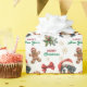 The repeated pattern on this Christmas wrapping paper includes an image of a Bernese Mountain Dog wearing a red and white Santa Claus hat. Also included in the pattern is a gingerbread man, a red bow, a holly sprig with red berries, and varied sizes of ornate gold snowflakes. Stylised red and green text says MERRY CHRISTMAS" and "HAPPY NEW YEAR". Be sure to see the many other products with dog images (and cats, too!) at Dog Village.