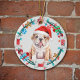 On the front of this Holiday ornament is an image of a cute brown and white Bulldog puppy wearing a Santa hat. The dog is enclosed within a Christmas wreath made of wrapped bones, gold stars, gift packages, and string lights. The back of the ornament has the same wreath with custom text in red, gold and green. Easily change the year to a name to personalise it, if you'd like.