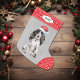 The front of this Holiday stocking shows an image of a black and white Cocker Spaniel wearing a Santa hat. The image is placed on a silver grey background, and the toe and top border are a red and white snowflake pattern. On the top border is a white label with your custom text in dark grey. The back of the stocking is the same red and white snowflake pattern.