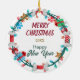 On the front of this Holiday ornament is an image of a cute Golden Retriever puppy wearing a Santa hat. The dog is enclosed within a Christmas wreath made of wrapped bones, gold stars, gift packages, and string lights. The back of the ornament has the same wreath with custom text in red, gold and green. Easily change the year to a name to personalise it, if you'd like.