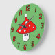 A clock with a festive mushroom and matching red numbers.