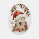 On the front of this Holiday ornament is the image of an adorable white polar bear wearing a red and white Santa Claus hat and a neck scarf. At the top is a half wreath of holly leaves with red berries. On the back, red text says MERRY CHRISTMAS", and there are additional text fields for you to personalise the ornament. Cute for a daughter, granddaughter, son or grandson.