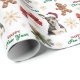 The repeated pattern on this Christmas wrapping paper includes an image of an adorable Rat Terrier dog wearing a red and white Santa Claus hat. Also included in the pattern is a gingerbread man, a red bow, a holly sprig with red berries, and varied sizes of ornate gold snowflakes. Stylized red and green text says MERRY CHRISTMAS" and "HAPPY NEW YEAR". Be sure to see the matching gift tags in our store.