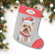 The front of this Holiday stocking shows an image of a Yorkshire Terrier wearing a Santa hat. The image is placed on a silver grey background, and the toe and top border are a red and white snowflake pattern. On the top border is a white label with your custom text in dark grey. The back of the stocking is the same red and white snowflake pattern.