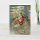Here comes Santa! He is steering his amazing flying machine through the night sky. Stars, streamers and fancy decorations bedeck the aircraft and its load of wonderful toys for Christmas morning. The restored image of a Victorian postcard features a frosty background, gold accents and beautiful, bright colours. It is framed in icicles and ornaments with a Christmas village in the background.