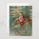 Here comes Santa! He is steering his amazing flying machine through the night sky. Stars, streamers and fancy decorations bedeck the aircraft and its load of wonderful toys for Christmas morning. The restored image of a Victorian postcard features a frosty background, gold accents and beautiful, bright colours. It is framed in icicles and ornaments with a Christmas village in the background.