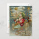 Here comes Santa! He is steering his amazing flying machine through the night sky. Stars, streamers and fancy decorations bedeck the aircraft and its load of wonderful toys for Christmas morning. The restored image of a Victorian postcard features a frosty background, gold accents and beautiful, bright colours. It is framed in icicles and ornaments with a Christmas village in the background.