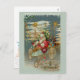 Here comes Santa! He is steering his amazing flying machine through the night sky. Stars, streamers and fancy decorations bedeck the aircraft and its load of wonderful toys for Christmas morning. The restored image of a Victorian postcard features a frosty background, gold accents and beautiful, bright colours. It is framed in icicles and ornaments with a Christmas village in the background.