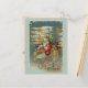 Here comes Santa! He is steering his amazing flying machine through the night sky. Stars, streamers and fancy decorations bedeck the aircraft and its load of wonderful toys for Christmas morning. The restored image of a Victorian postcard features a frosty background, gold accents and beautiful, bright colours. It is framed in icicles and ornaments with a Christmas village in the background. In keeping with the antique style, the reverse side of the postcard also features a nineteenth century design.