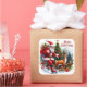 A joyful Santa Claus is seen ice skating alongside a cheerful reindeer. The festive backdrop includes a beautifully decorated Christmas tree and colourful gifts, creating a delightful holiday atmosphere filled with cheer and celebration.