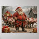 Santa stands happily in front of a wooden sleigh filled with wrapped presents, pulled by four cheerful pigs. A rustic cottage and snowy landscape create a cozy holiday setting.