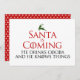 Enjoy a little pop culture holiday humour with this design that features the words “Santa is Coming. He drinks cocoa and he knows things” set in a familiar fantasy typeface. Typography is in Christmas red and black and set above the words is a forest green silhouette of a reindeer. The reverse side features an all-over pattern of white reindeer on a red background. The centre back has an open white rectangle, perfect for your custom holiday greeting and names.