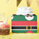 Santa Claus looking super cool wearing sunnies, set against a green background with his belt above and a red gold star pattern