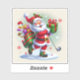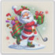 Amidst a whimsical winter wonderland, Santa cheerfully carries a beautifully wrapped present in one hand and a vibrant bag full of golf clubs in the other.