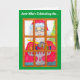 A cute whimsical picture of Santa lighting the menorah candles adorns this card.