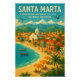 Vertical 2:3 vibrant tropical travel poster of Santa Marta, Colombia; sweeping view of the Caribbean coastline with turquoise water, white-sand beaches, and palm trees swaying in the warm breeze. Include the picturesque historic center with Spanish colonial façades, colorful streets, and lively plazas. In the background, show the dramatic snow-capped peaks of the Sierra Nevada de Santa Marta rising above the coast, creating a striking contrast between tropical sea and high mountains. Add fishermen boats, beach umbrellas, and subtle wildlife such as frigatebirds in the sky. Warm golden sunlight, relaxed Caribbean ambiance. Color palette: bright aquas, lush greens, terracotta reds, and sunlit golds. Bold headline: ‘SANTA MARTA — CARIBBEAN GATEWAY TO THE SIERRA NEVADA’ in elegant coastal travel typography.”