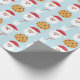 This fun gift wrap features Santa with milk and cookies with a blue background.