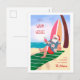 Original illustration of Santa on the Beach with tropical drink leaning on a surfboard; add text or a photo to the back if desired. ©Becky Nimoy 2021
