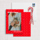 This holiday photo card features a photo of your cat surrounded by a border of white paw prints and white stars on a red background with a punny Christmas greeting reading "Here comes Santa Paws" and "Meowy Christmas!". This Christmas photo card is perfect for the pet owner or animal lover.