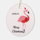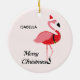 This animal Christmas ornament features a pink flamingo wearing a red Santa outfit. This fun, tropical bird, design includes the message “Merry Christmas” and a customisable name. Bring pink flamingo holiday cheer to your tree with this festive piece of Xmas decor. Simply add your special name, add this ornament to your cart, and have a very Merry Christmas.