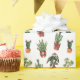 Pattern with illustrations of potted plants including aloe, cactus, and palm decorated with Christmas decorations including ornaments, bows, santa hat, and lights, and stars.