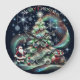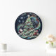 This modern, artistic clock features a stylized Christmas tree formed by glowing, swirling rainbow-colored ribbons of light, set against a dark, starry night sky with large snowflakes. A traditional Santa Claus stands to the left holding a staff, next to a large sack filled with gifts, with the words "MERRY CHRISTMAS" scripted above. The design may look real due to the high detail and three-dimensional texture in the artwork.