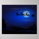 Santa Claus and his reindeer fly over the moon in the darkened blue night sky with stars. www.giftideas505.com