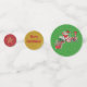 This table confetti has large circles with Santa Claus riding a peppermint candy train carrying letters to Santa and candy canes on a green background with gold flecks. The medium circles faux gold glitter with red Merry Christmas text. The small circles are vibrant red with gold stars.