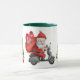 Get into the holiday spirit with this fun and festive ceramic mug featuring Santa Claus on a thrilling ride! Santa is shown riding a small, grey motorcycle loaded with gifts, ready to spread holiday cheer. On each side of the mug, beautifully decorated Christmas trees stand adorned with colourful ornaments, with plenty of gift boxes nestled below the trees. This unique design brings a playful twist to Christmas, making it the perfect mug for holiday lovers and those who enjoy a dash of adventure in their seasonal celebrations.