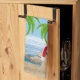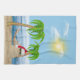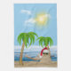 Cute Christmas sandman wearing sunglasses and a Santa hat in beach sand with a hammock and light string in palm trees.