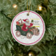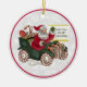 Round ceramic ornament with a vintage 1940s image of jolly Saint Nick waving greetings from his car adorned with peppermint candies in snowfall. Red border. The back has an image of snowfall and optional text. See the entire Holiday Ornament collection in the PARTY FAVORS section.