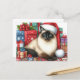 This Christmas postcard showcases a Siamese cat adorned with a Santa hat, nestled among elegantly wrapped presents. This design is sure to delight any cat enthusiast as a festive greeting.