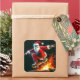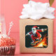 Santa Claus showcases impressive skateboarding skills, soaring through the air above a crackling festive fire. The vibrant colours highlight the playful atmosphere, capturing the spirit of Christmas in an unusual and energetic way.