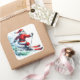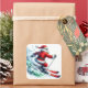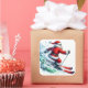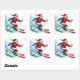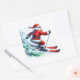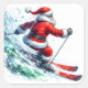 Santa is gliding down a snowy slope, dressed in his classic red suit with white fur trim. Wearing sunglasses, he expertly manoeuvres on skis, creating splashes of snow in a cheerful winter setting.