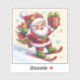 A cheerful Santa, dressed in vibrant red and green attire, glides down a snowy slope while joyfully carrying a stack of brightly wrapped gifts.
