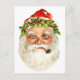 Vintage Christmas Holiday image of Santa Claus smoking a pipe. He's wearing a red hat decorated with holly leaves and berries.