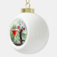 White ceramic Christmas ornament with a photo of a cute squirrel wearing a red and white Santa Claus hat sipping a big red cocktail from an umbrella straw. The back of the ornament has your choice of a Christmas tree, a wreath, or a pointsettia. Any squirrel lover (or anyone who loves their cocktails!) would get a laugh out of this fun ornament that you can use to decorate your Christmas tree with for many years to come.